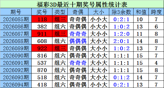 奇偶比:上期奇偶比为1:2,形态为偶奇偶,奇数走冷,本期注意奇数回补,参考奇偶比2:1,形态关注奇奇偶。